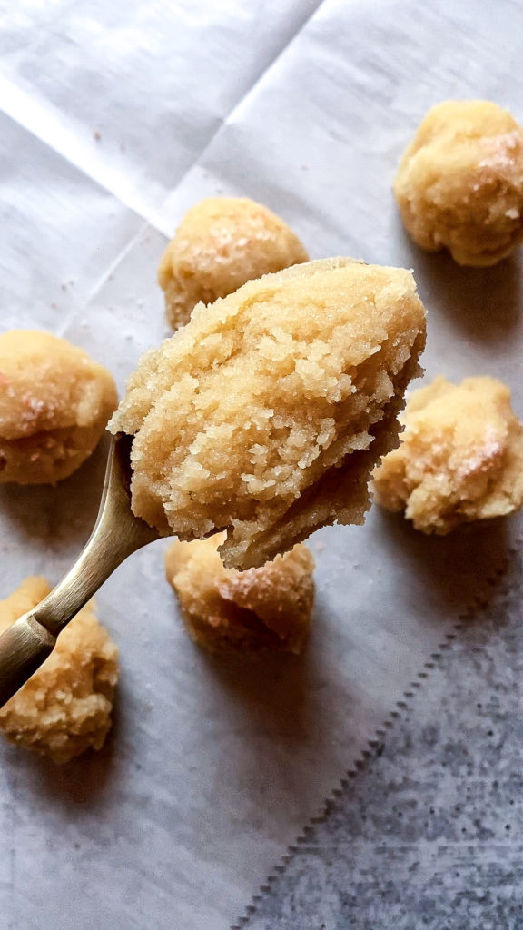 This edible sugar cookie dough, on the other hand? It’s pure magic. By hydrating the almond flour just enough, AKA past the marzipan stage, it soaks up the liquid and turns into something that mimics soft, creamy, scoopable cookie dough. So yes, similar ingredients but a totally different result.