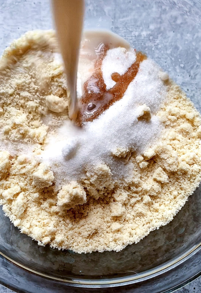 - Add 1/2 teaspoon of vanilla extract and 120 grams of plant-based milk. Mix with a fork until a “dough” starts to form.