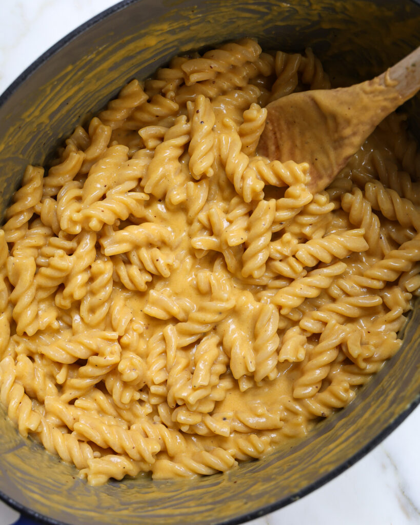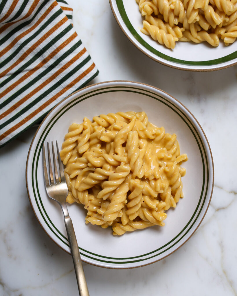 Then you melt the cheddar directly into that warm purée, adding pasta water to emulsify everything into that silky, glossy texture we all love. It’s the same concept as boxed macaroni, something simple that you can easily make delicious.