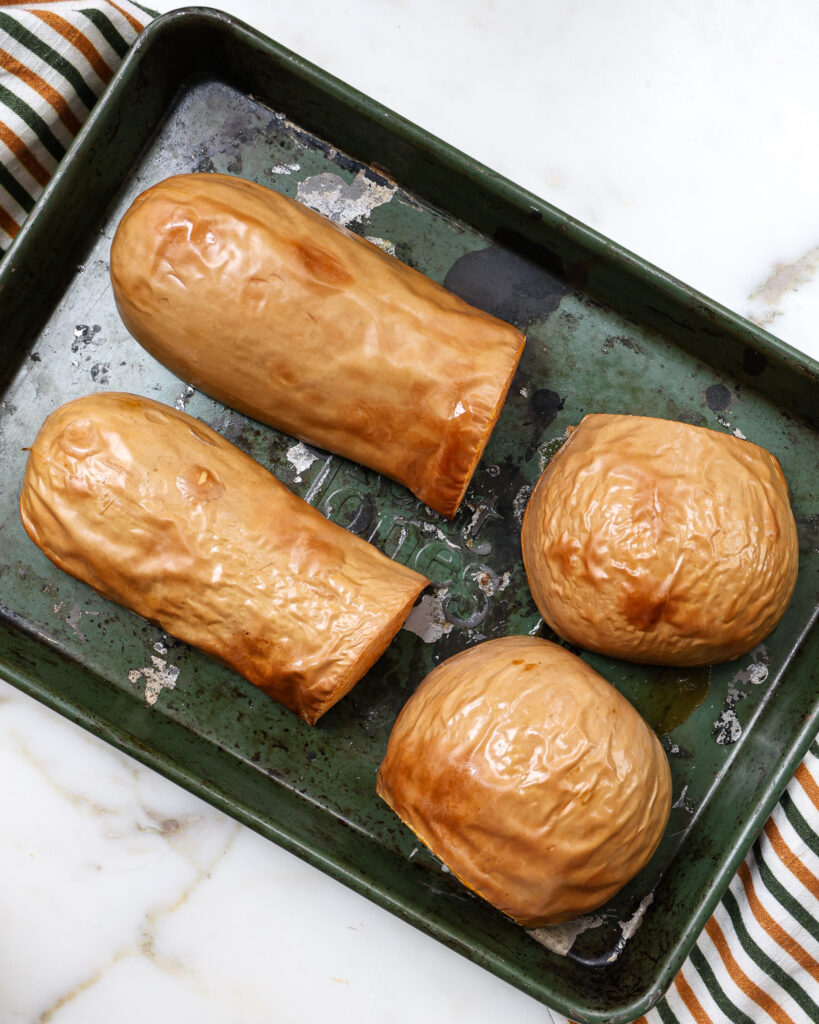 - Place the squash cut-side-down on a baking sheet and roast for 30-40 minutes, or until the squash is softened throughout.
