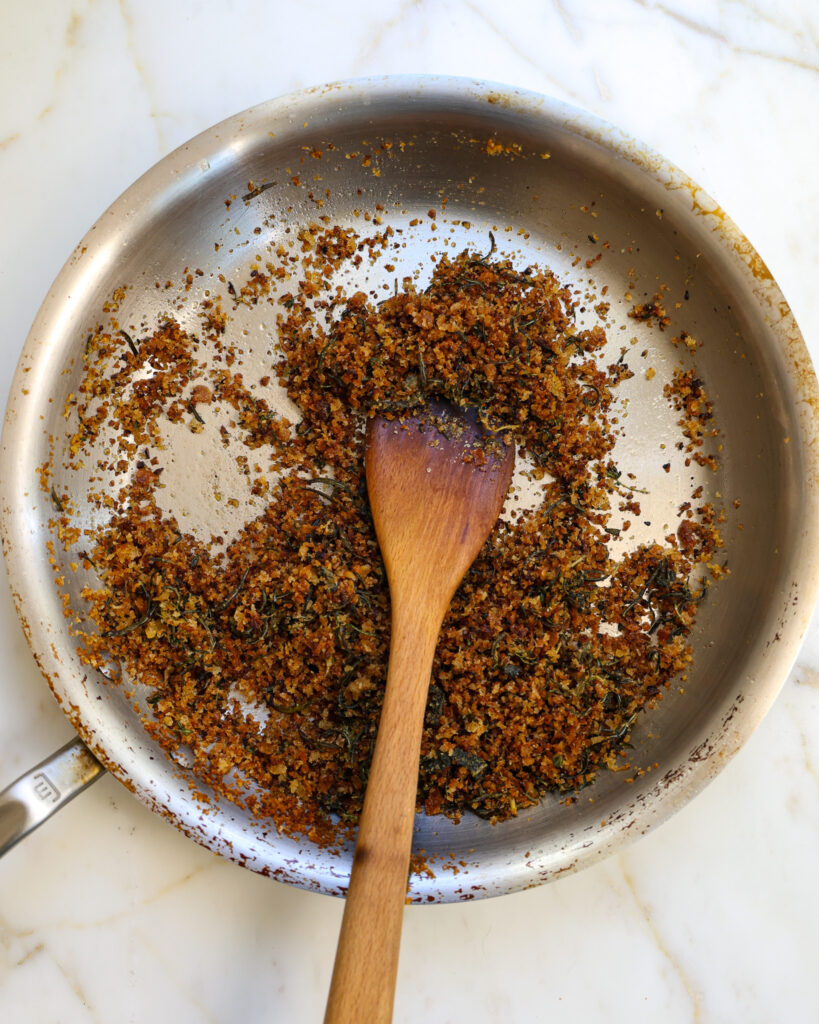 I love making a flavorful and quick bread crumb topping in a pan. It feels like my hack for making things taste breaded and fried, when they really aren’t breaded at all.