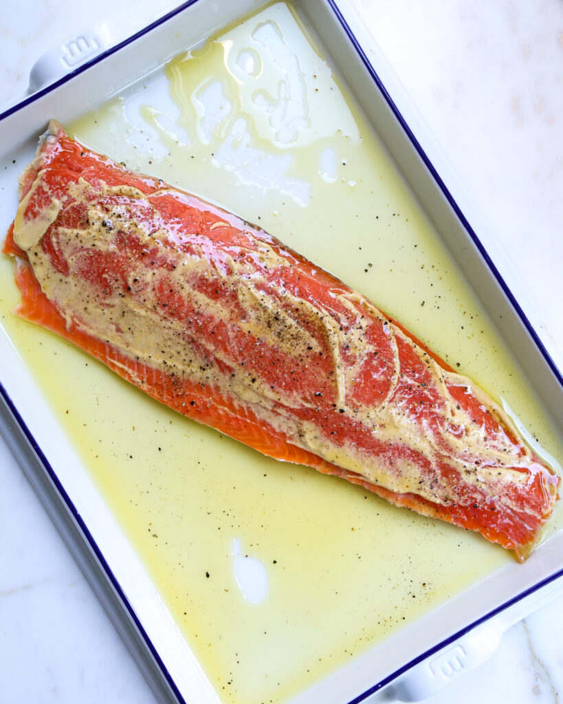 - Place the salmon in one piece on a large baking tray. Spread the mustard all over the salmon, then season it liberally with salt and pepper. Cover with 3 tablespoons of olive oil.