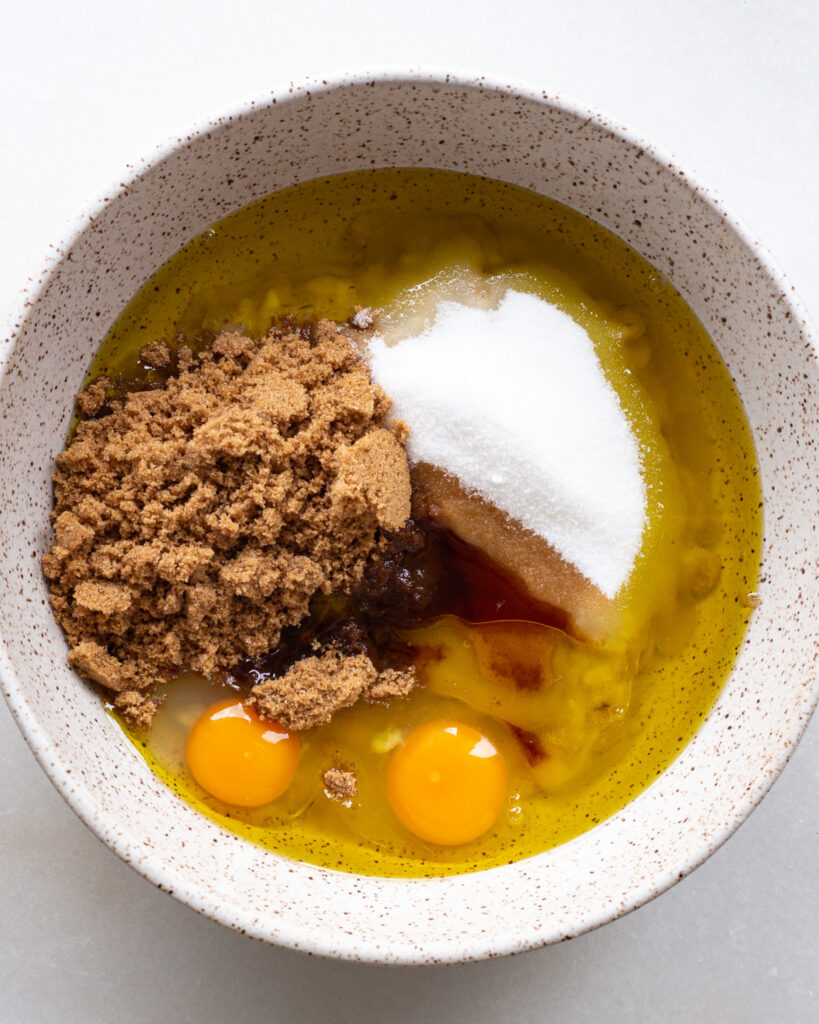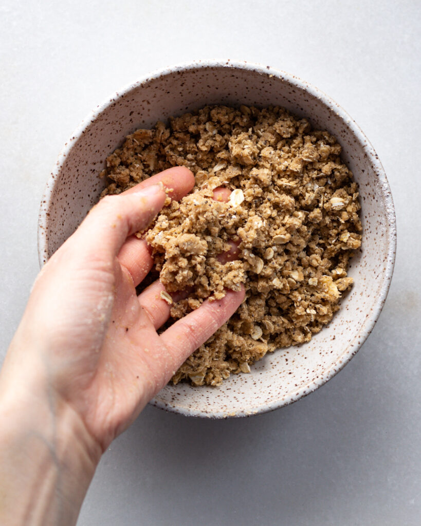 Add the chilled butter and the flour for the crumble topping. Toss to coat the butter in flour, then add the sugar and rolled oats. Work the butter into pieces with your hands, consistently tossing to coat in the flour and sugar. You’re looking to make a crumb-like texture, with pieces no bigger than the tip of a pencil eraser. Set this in the fridge while you prep the rest of the recipe.