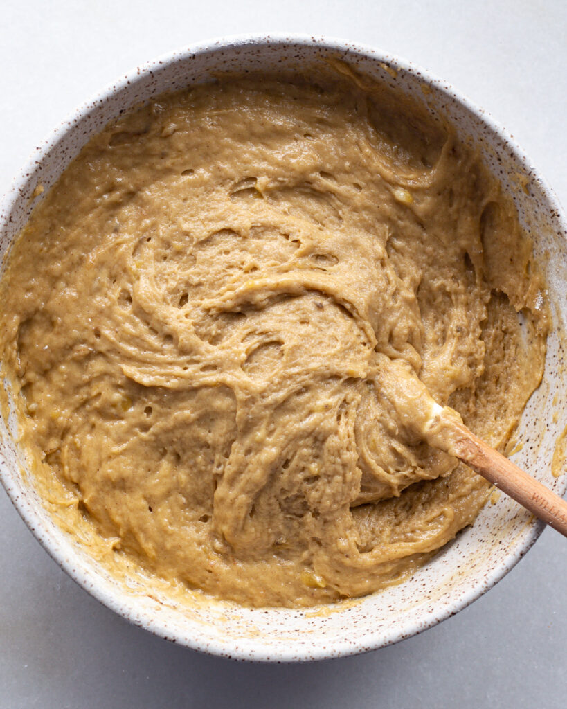 Add the dry ingredients to the wet in batches, and mix to combine. You’ll have a thick, delicious banana batter in seconds. Try not to eat it all while you prep the rest of the recipe 😉