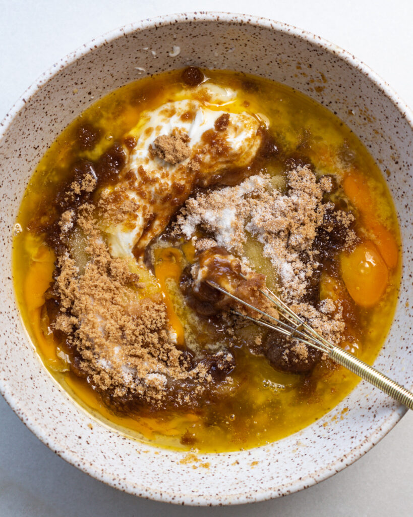 - In a large bowl, whisk together the eggs, butter, sugars, yogurt, and vanilla until smooth.