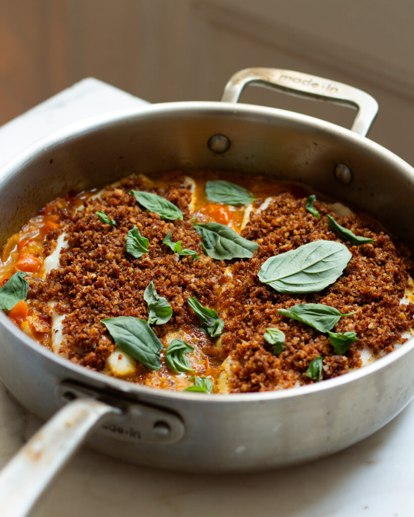 What makes this halibut recipe work so well is the process. You start by toasting your breadcrumbs in the pan until they are golden and crunchy. Then you transfer them out of the pan and use the same pan to cook down the aromatics and tomatoes into a jammy sauce. The halibut quickly steams on top, then you add back the breadcrumbs, and you’re done! What you’re left with is a fish that tastes like it was breaded and fried, but is nowhere close. For an easy, impressive meal, this one is one of my favorites.