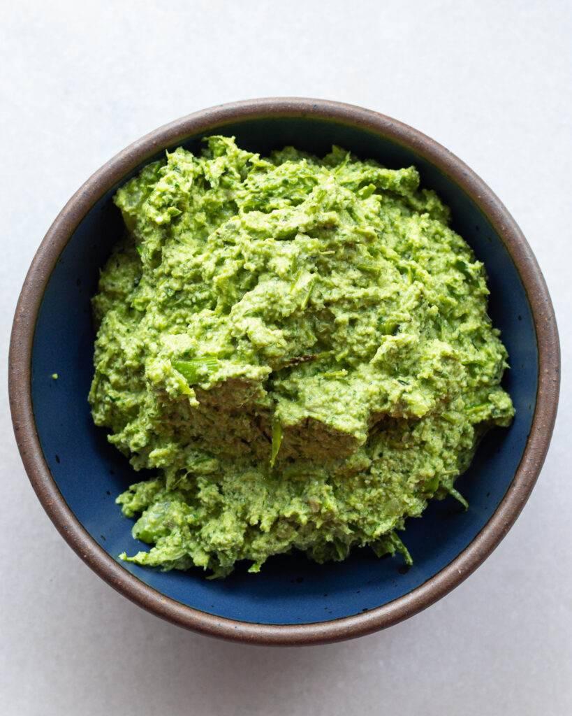 This spread is very similar to a pesto, but it’s fully plant-based and uses sunflower seeds instead of pine nuts, so it’s allergen friendly!