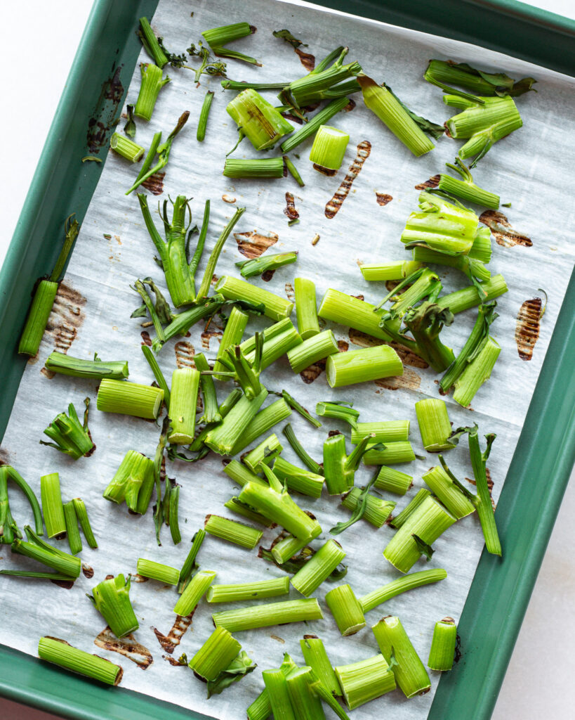 The bottoms will go in the oven naked – AKA no salt, no oil, nothing. They will roast twice as long as the broccolini tops because they are larger in size, but also because we want them to be smooth enough to blend in with the sunflower purée later!