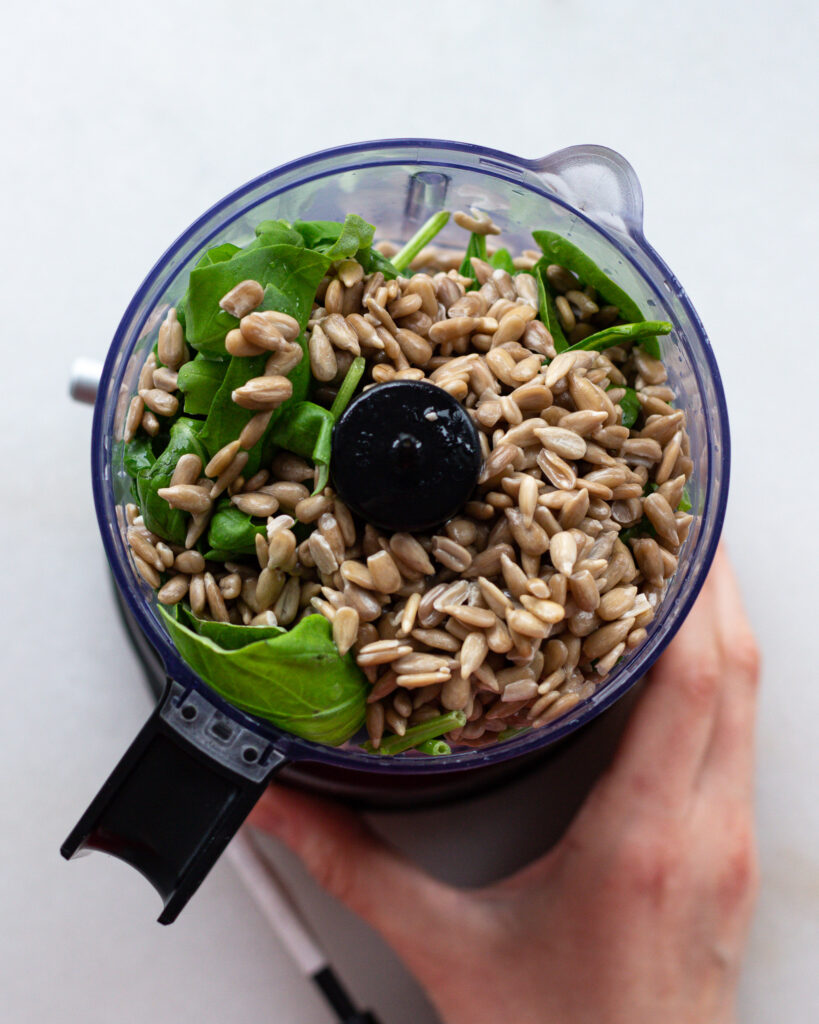 - Add the basil, anchovies, spinach, lemon juice, and 1/8 tsp of kosher salt to a food processor. When the sunflower seeds are softened, drain them and add them in as well. Process for an extended amount of time, about 2-3 minutes, drizzling in the olive oil gradually. Scrape down the sides and repeat until the mixture starts to become spreadable. If needed, you can add up to 1/4 cup of water to help the process.