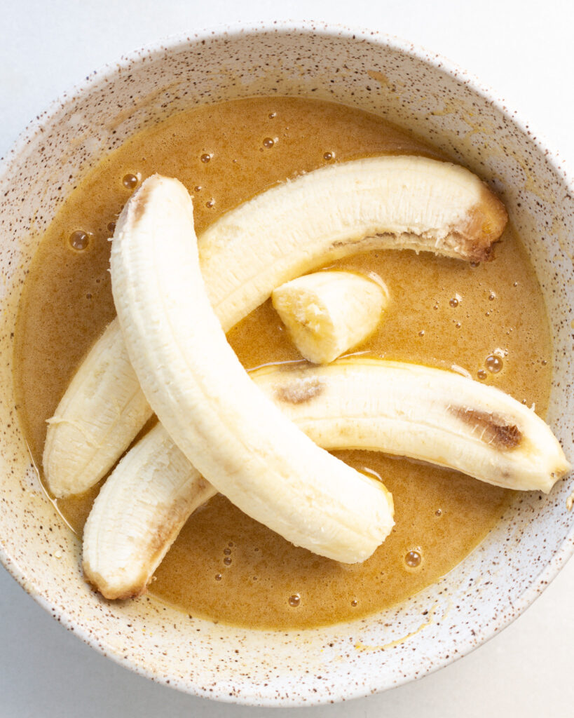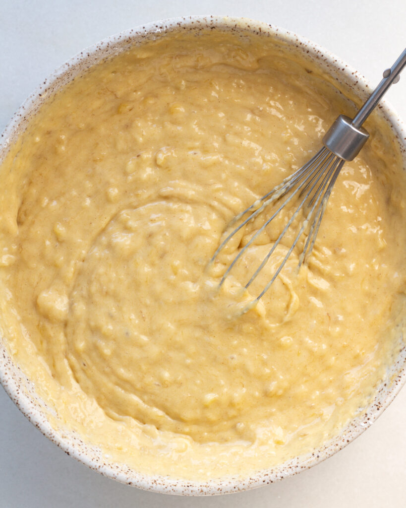 - Add the bananas directly into the bowl. Use a fork to mash them into small pieces, but you don’t need the bananas completely smooth. Switch to your whisk and whisk together.
