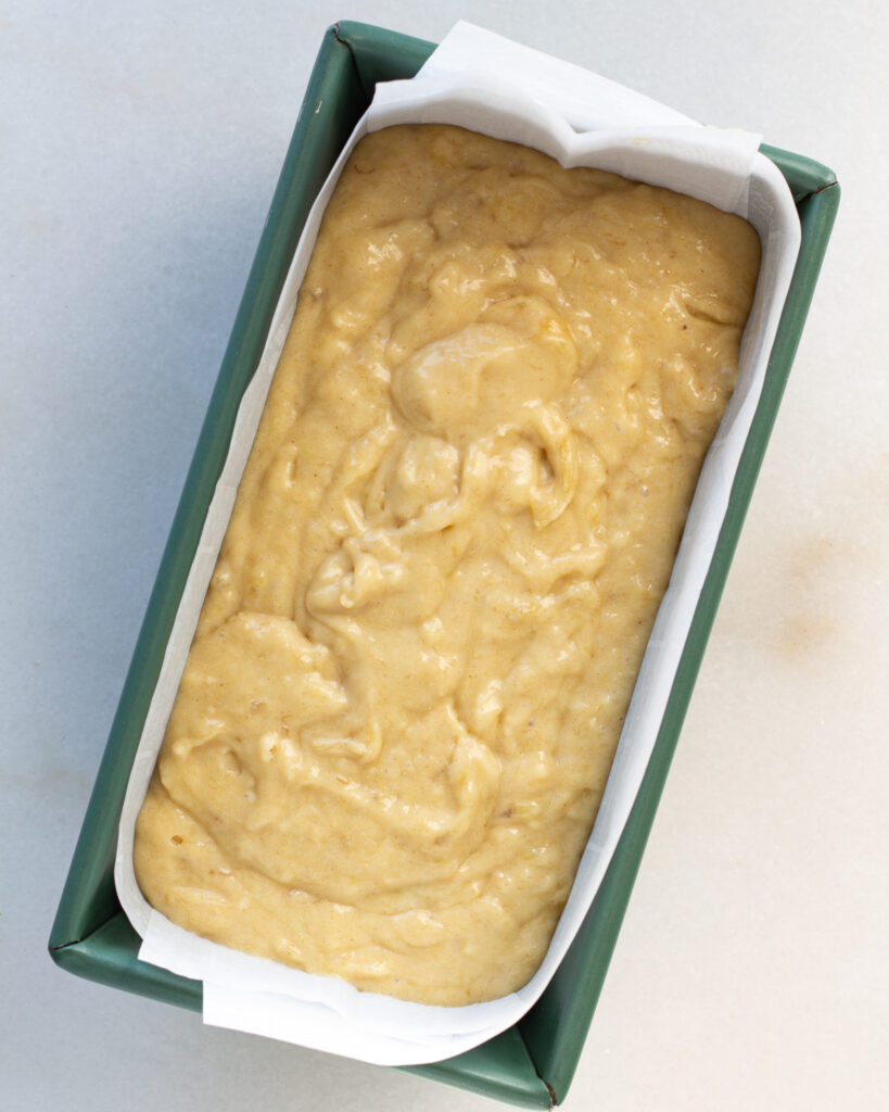 - Transfer the batter to a parchment-lined loaf tin and bake at 375°F for 50-55 minutes.
