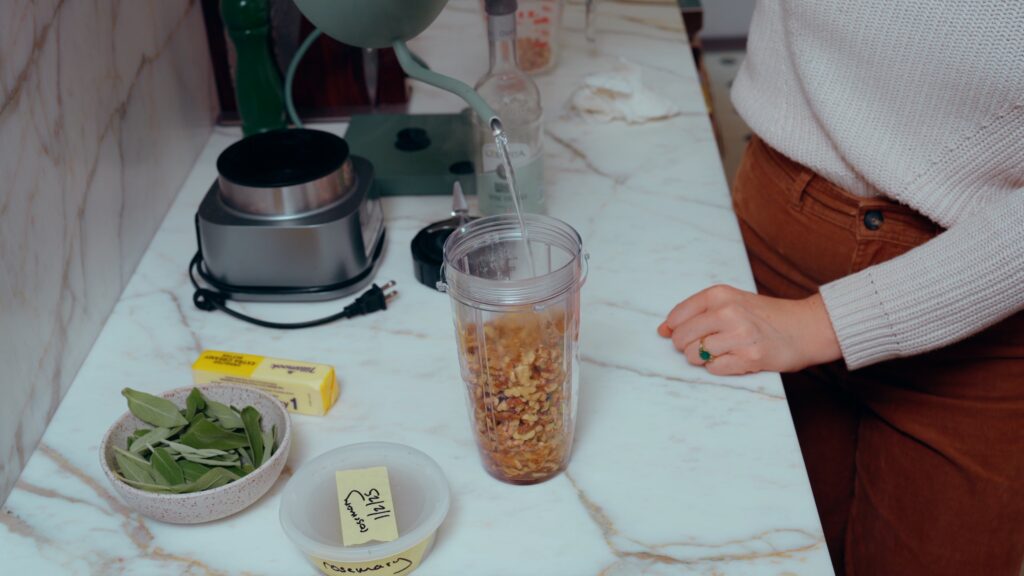 - Add half of the fried sage to the blender with the walnuts, along with 1 teaspoon dried rosemary, 1 teaspoon white wine vinegar and 1 teaspoon Diamond Crystal kosher salt (use half if using Morton’s).