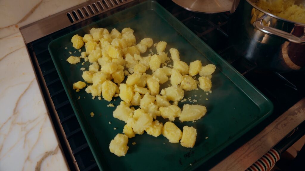 - Transfer the potatoes to a half sheet pan and place this in the freezer for 1-2 hours, or let it cool completely at room temperature. This is so all the moisture evaporates out of the potatoes. See Note*.