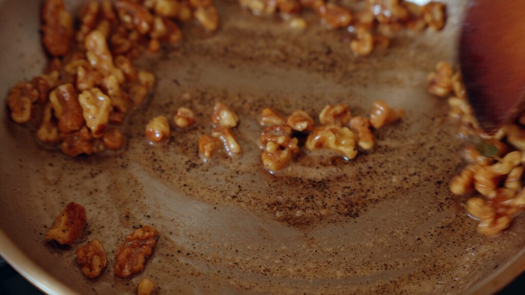 For this recipe, after the sage leaves are done, we throw some walnuts in there to get some brown butter love, too. While toasted nuts alone are delicious, getting some salty brown butter on the edges of these walnuts gives them a rich note that I love.