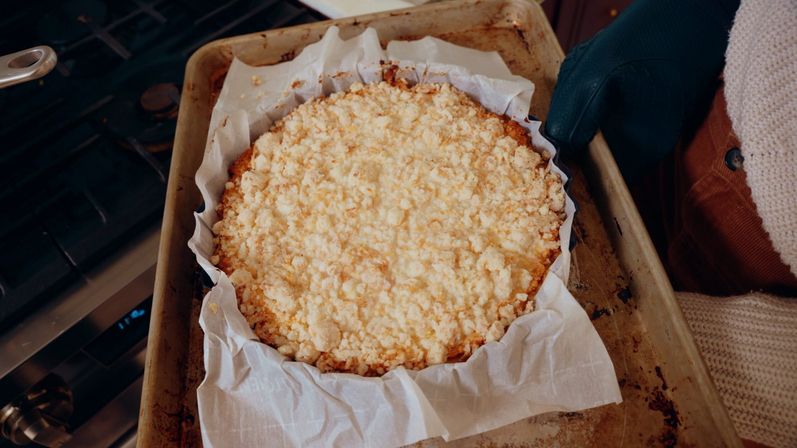 - Move the pan to a baking sheet to avoid any spilling. Give the sheet a few taps to let the batter settle.