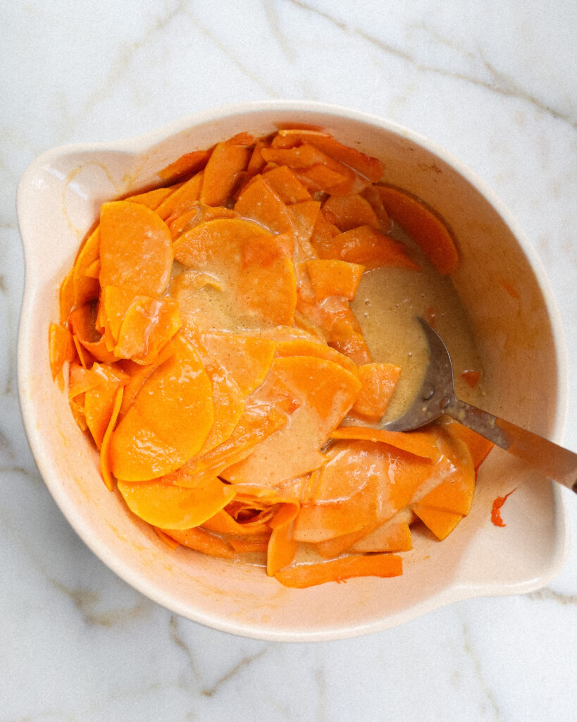 To make the butternut squash supremely soft, you have to thinly slice it with a mandolin. This is the only pain point of the recipe, and it’s worth it to get a perfectly soft butternut consistency in your cake.