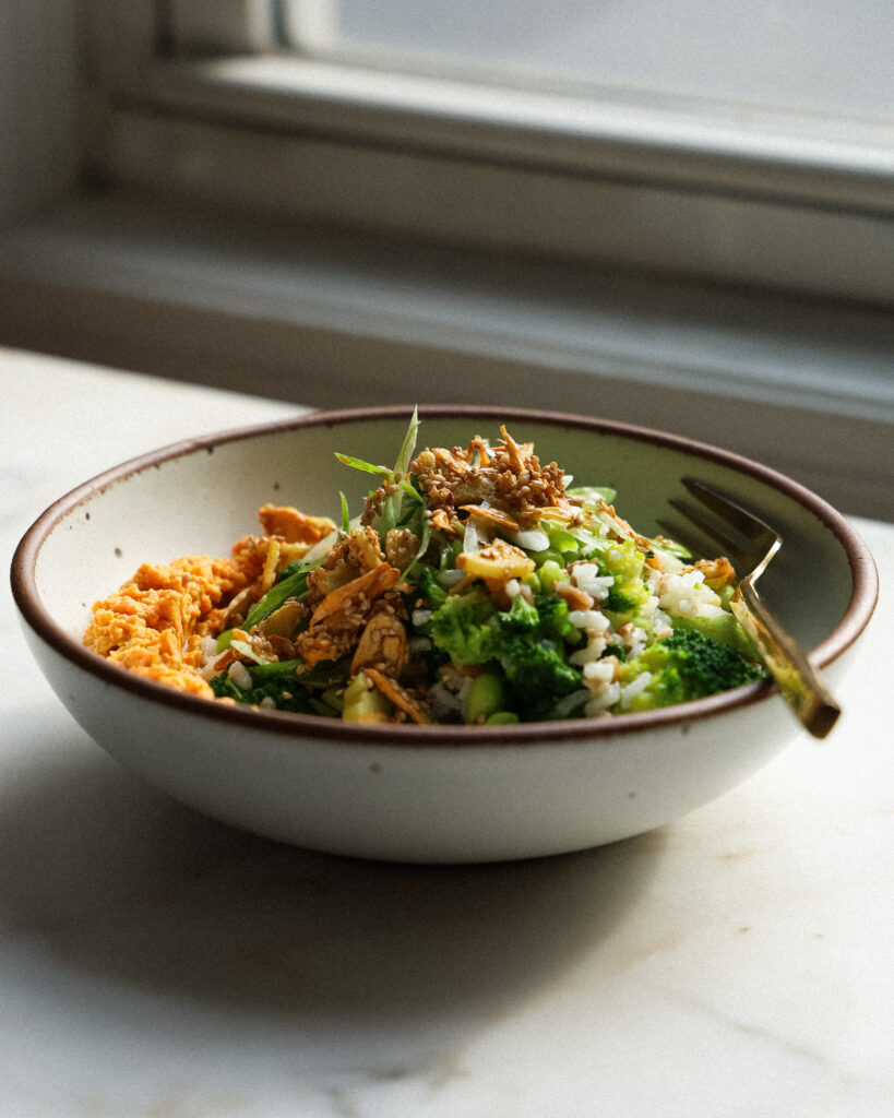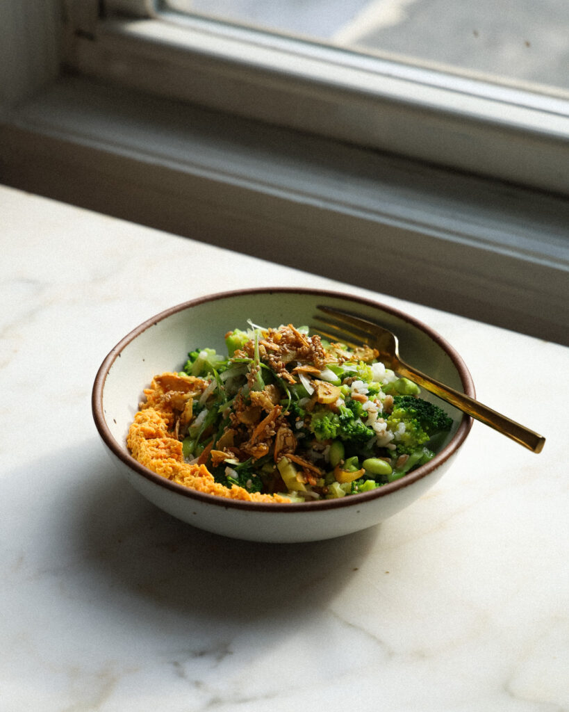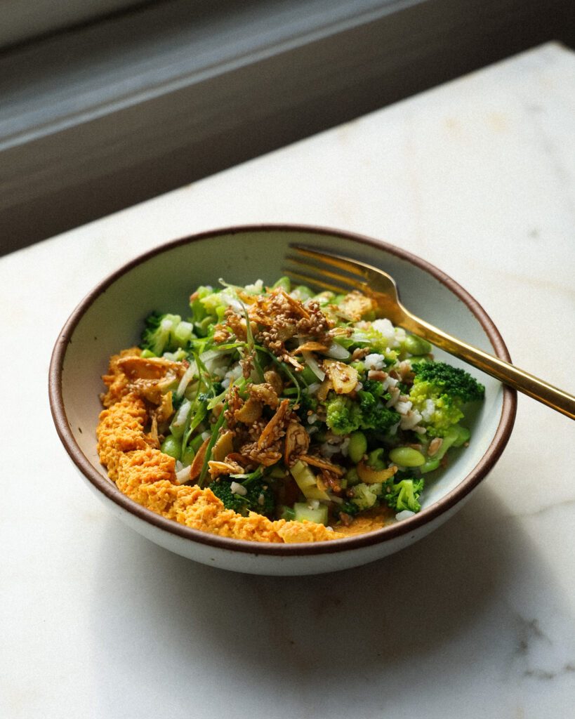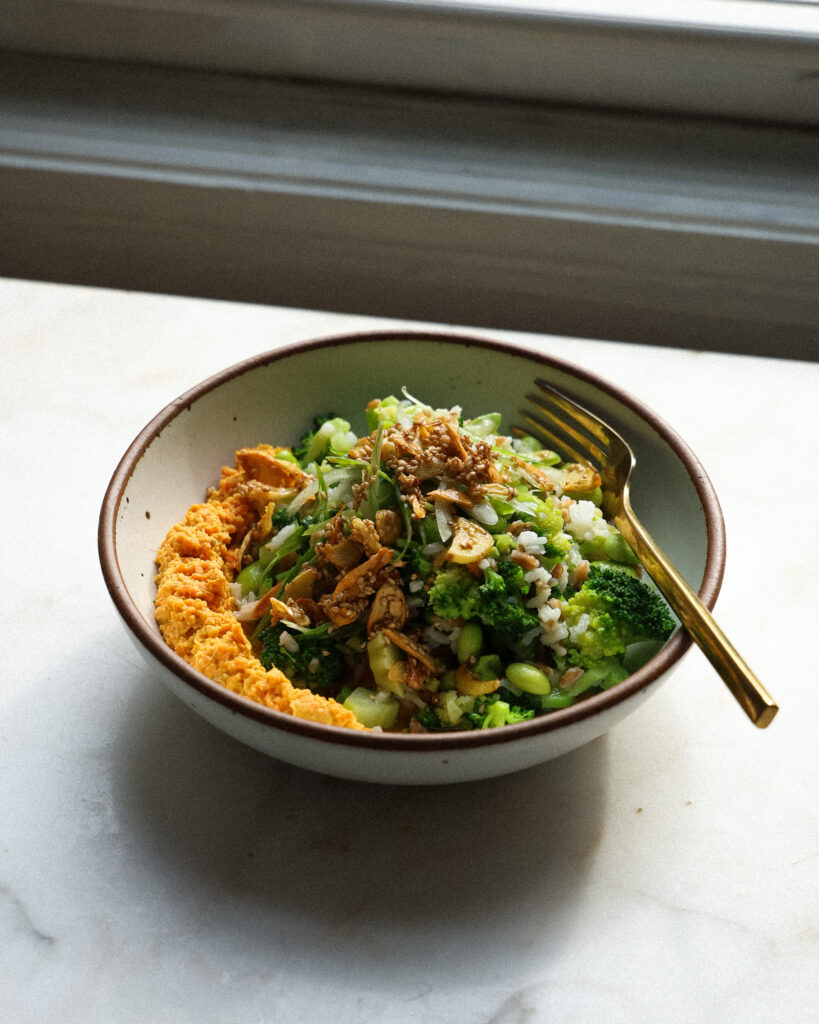 Now, this is an easy, wholesome, plant-based meal that is packed with protein. It’s designed for meal prep, but it’s also a great option for a four-serving dinner when you are craving a ton of vegetables, texture and flavor. The bowl begins with a quick and simple carrot ginger hummus, which is filled with immune-boosting ginger and lemony, bright flavor. Then I quickly blanch some broccoli to preserve its nutrients, then use that same water to boil some mixed grains. Finally, garlic, ginger and sesame seeds are fried in olive oil until toasty and crisp, and that reserved oil is used to make the dressing. Combine everything with edamame and you have a filling bowl that is overflowing with crisp, crunch, salty, and sweet. It’s one of my favorite vegan lunches or dinners on the site, and in the winter I find myself making it on repeat.