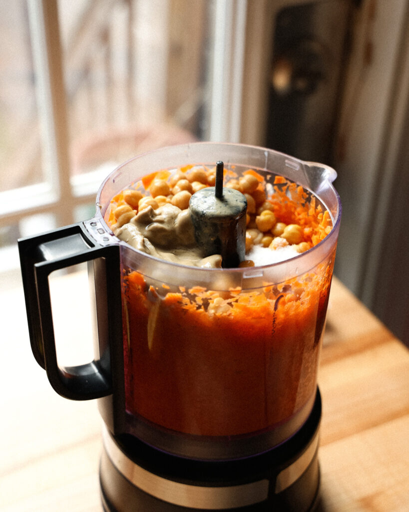 - Begin by making the carrot ginger hummus. Peel and slice 9 ounces of carrots (about 2 large carrots, or 3 medium). Add them to a food processor with a peeled 1 1/2-inch long knob of ginger and 2 garlic cloves. Pulse until everything is finely chopped.