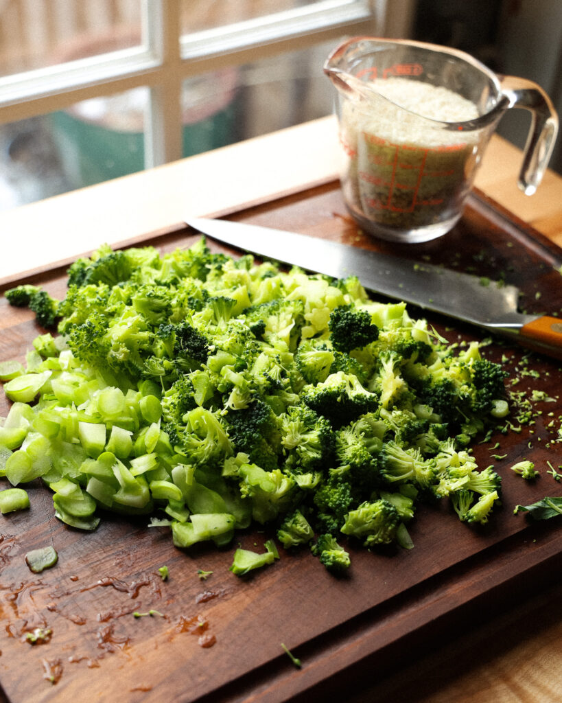 - Next prepare the rice and broccoli base. Chop the broccoli into bean-sized pieces.