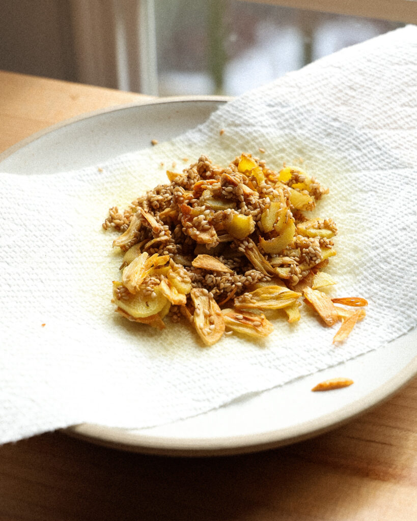 - NEXT, A CRISPY SESAME GARLIC TOPPING – I love having multiple types of crunch, and slowly frying garlic chips, sesame seeds and ginger together makes the most addictive bowl finisher.