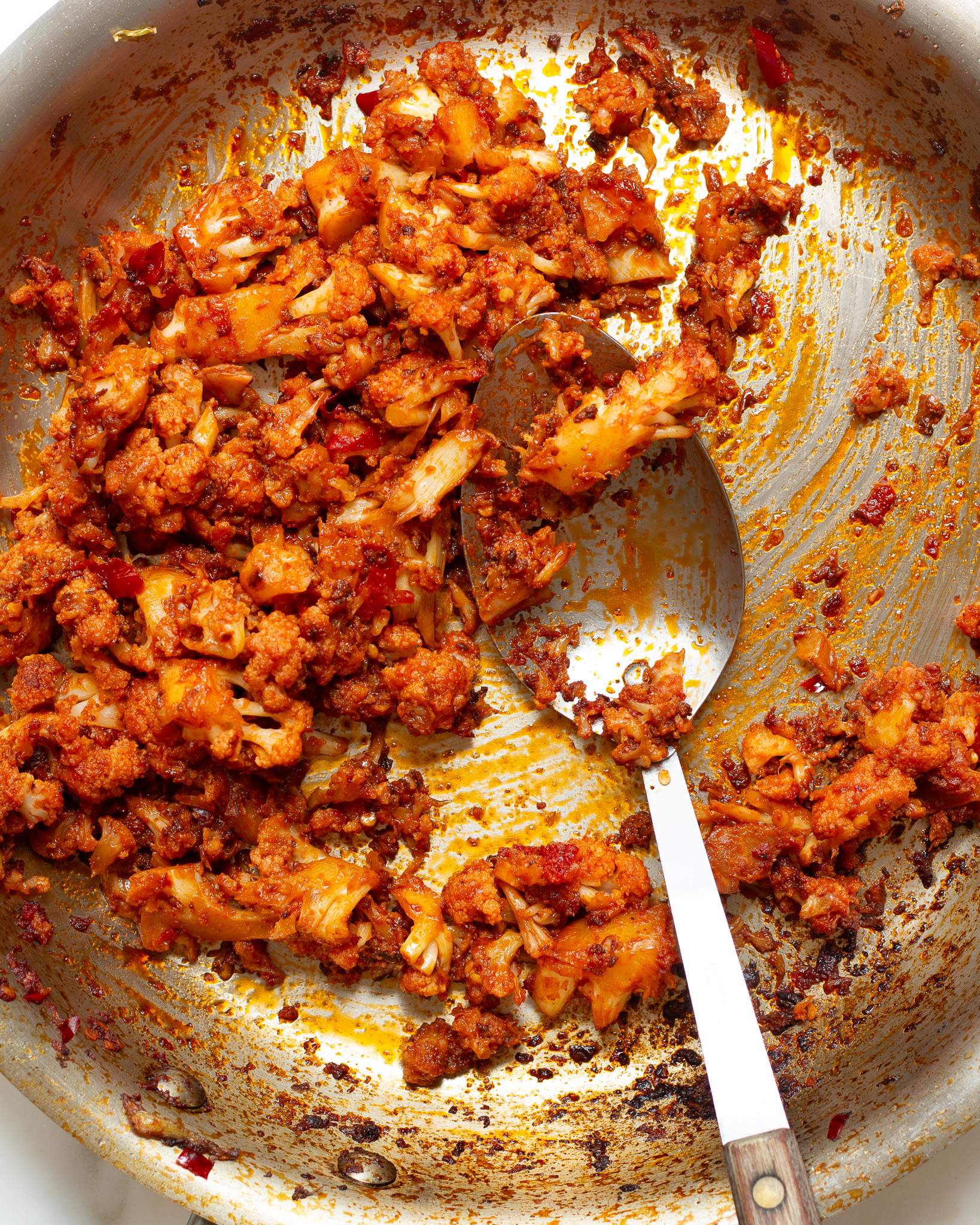- Add in the cauliflower florets, reserving about 2/3 cup of small florets for later, and stir to coat everything. Season with a pinch or two of salt and a few cracks of black pepper.