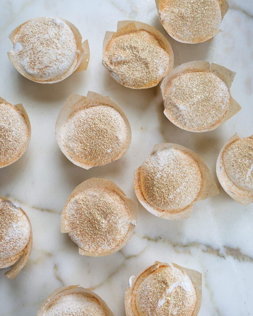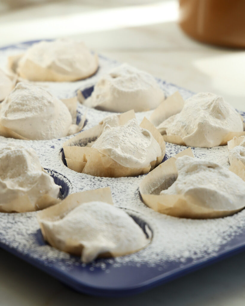 - Use a cookie scoop to portion out the marshmallows – this can either be in little mounds on a piece of parchment paper, or in muffin tins. If the scoop gets sticky, dip it in warm water and that should make the marshmallow easy to scoop and release.