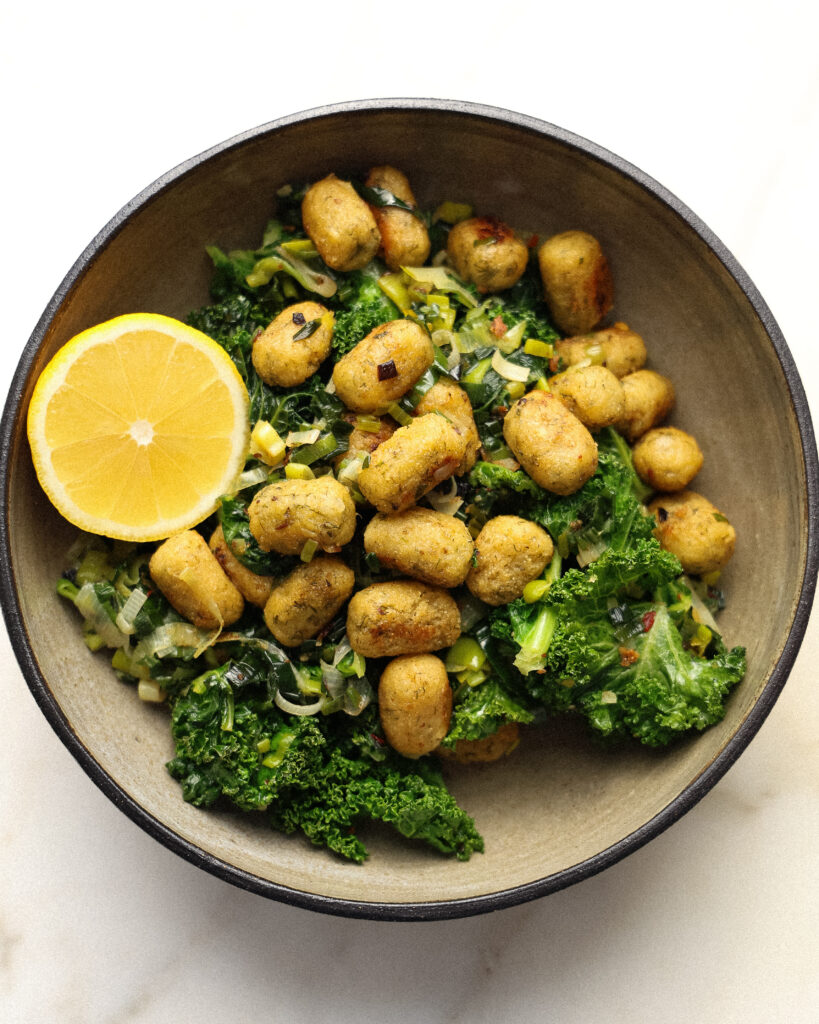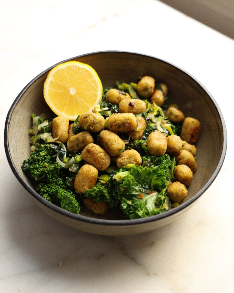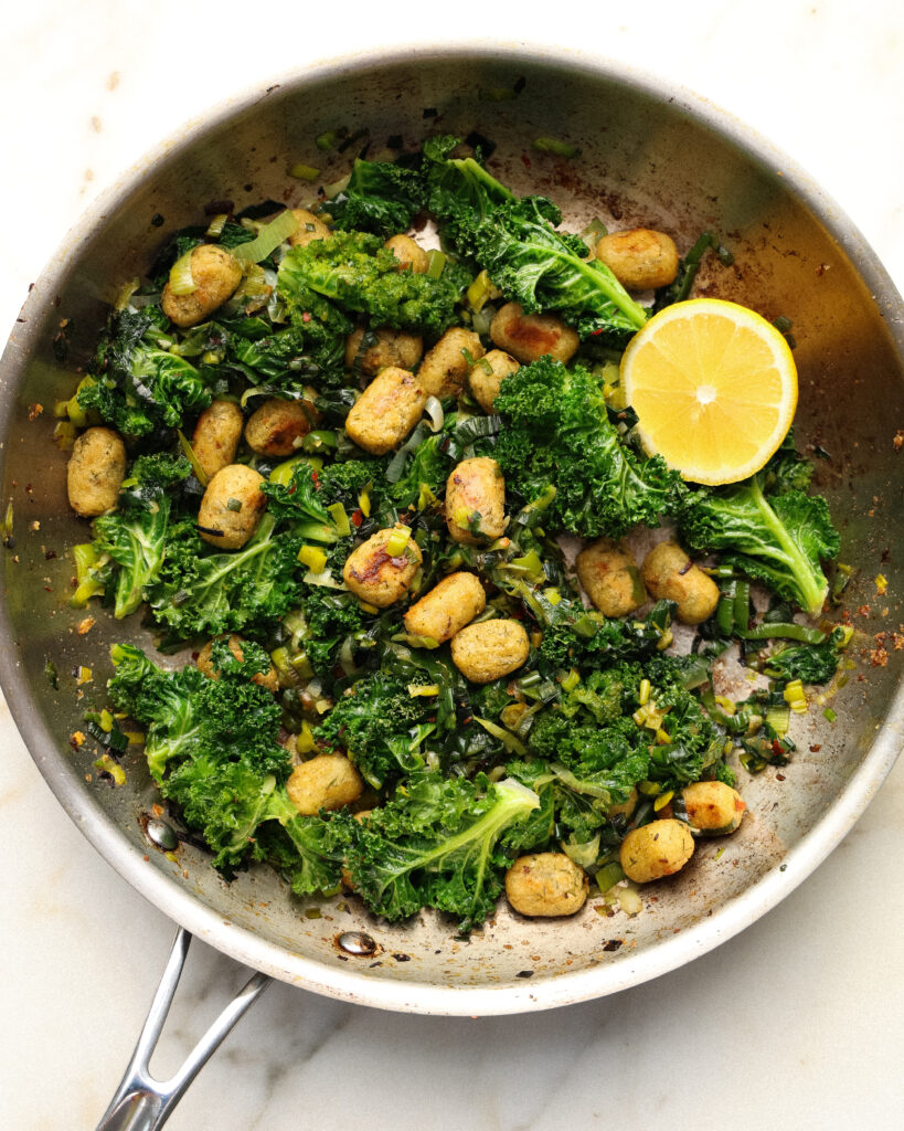 - Transfer the greens back into the pan with the crispy gnocchi. Season with more salt and pepper as preferred and finish with a squeeze of lemon juice from half a lemon.