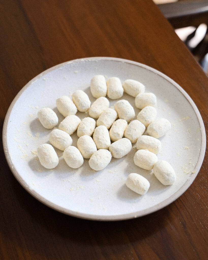 - Add a tablespoon of chickpea flour to a plate. Scoop the “gnocchi” dough into 1 teaspoon-sized balls. Roll them into an oblong shape like gnocchi, then add them to the plate and lightly dust all sides with the chickpea flour. This seals the “gnocchi.”