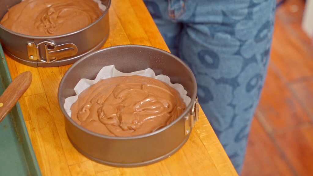 - Begin by lining two 8-inch springform pans with parchment paper. Set to the side.