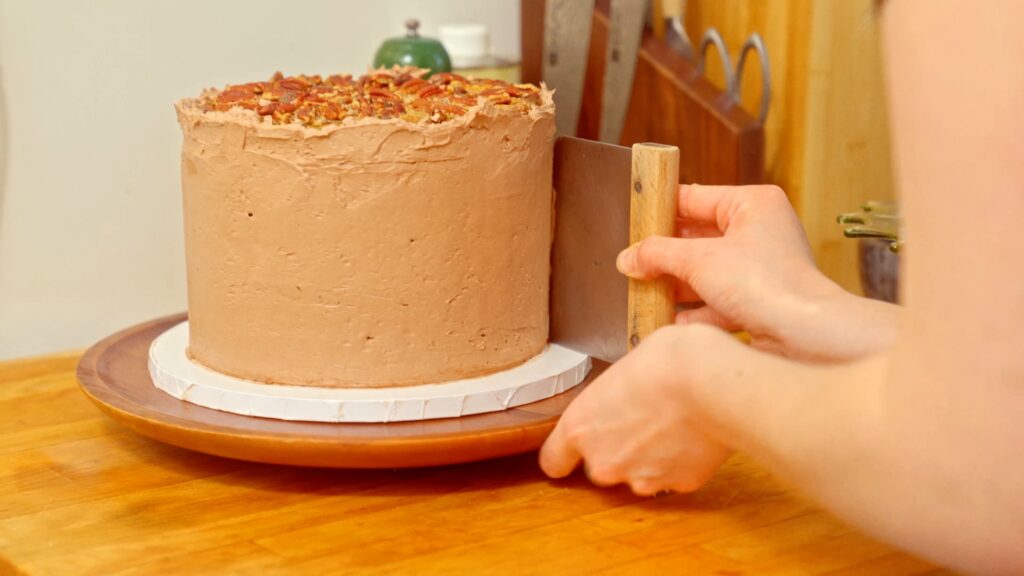 - First, use the chocolate bourbon buttercream to seal the exposed edges where the frosting layers peek out. Then use a thicker layer to smooth onto the outside of the cake. You want the pecan pie circles visible on top, but a smooth chocolate buttercream all over the sides.