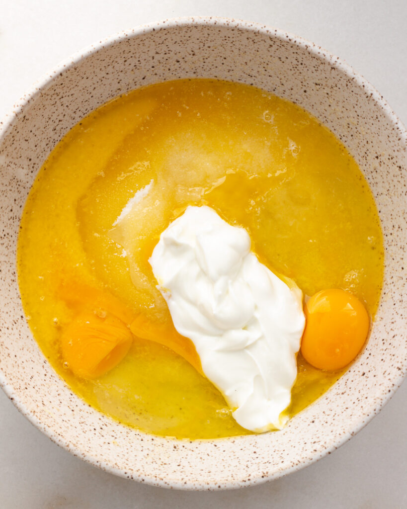 - In a large bowl, beat together the eggs, butter, sugar, skyr and vanilla until very smooth.