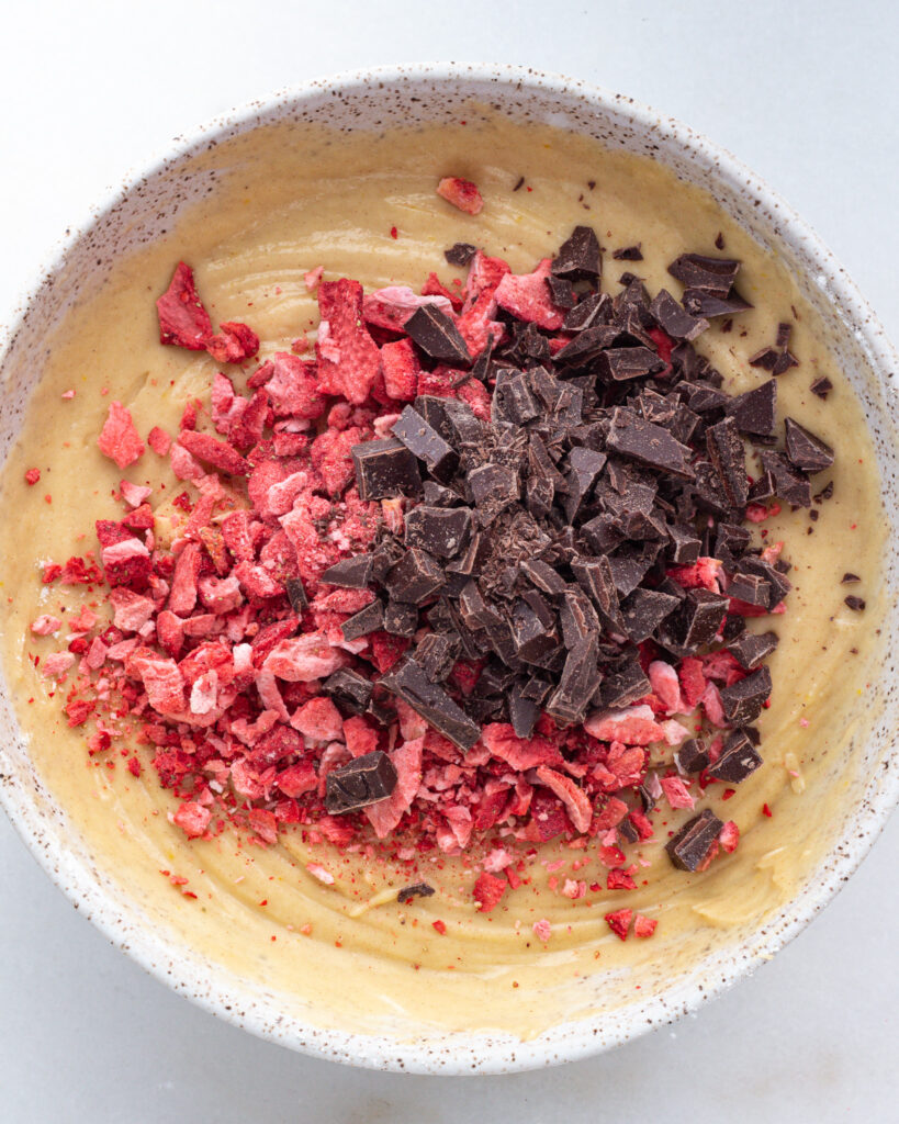 In batches, add the dry ingredients to the wet, alternating with splashes of the milk. Mix until a smooth batter forms. Add in the chopped freeze-dried strawberries and the chopped chocolate. Swirl to combine. And the batter is done!