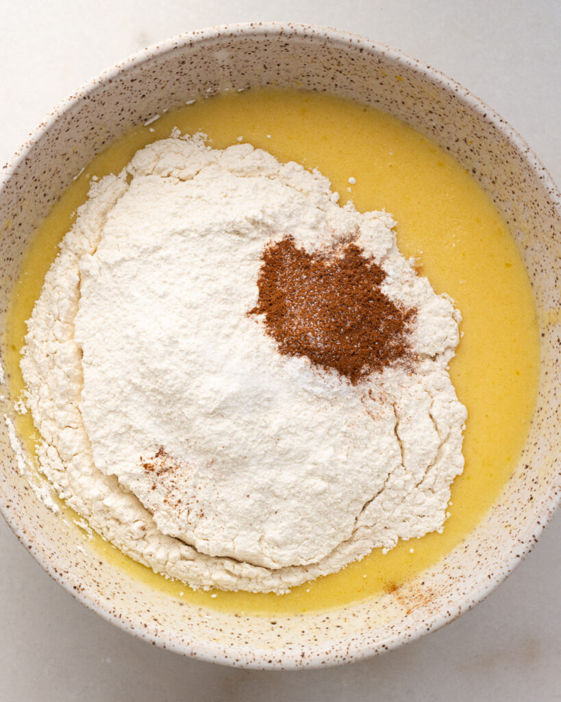 The batter for this is super simple, in a medium bowl, whisk together the flour, baking powder, salt and cinnamon.