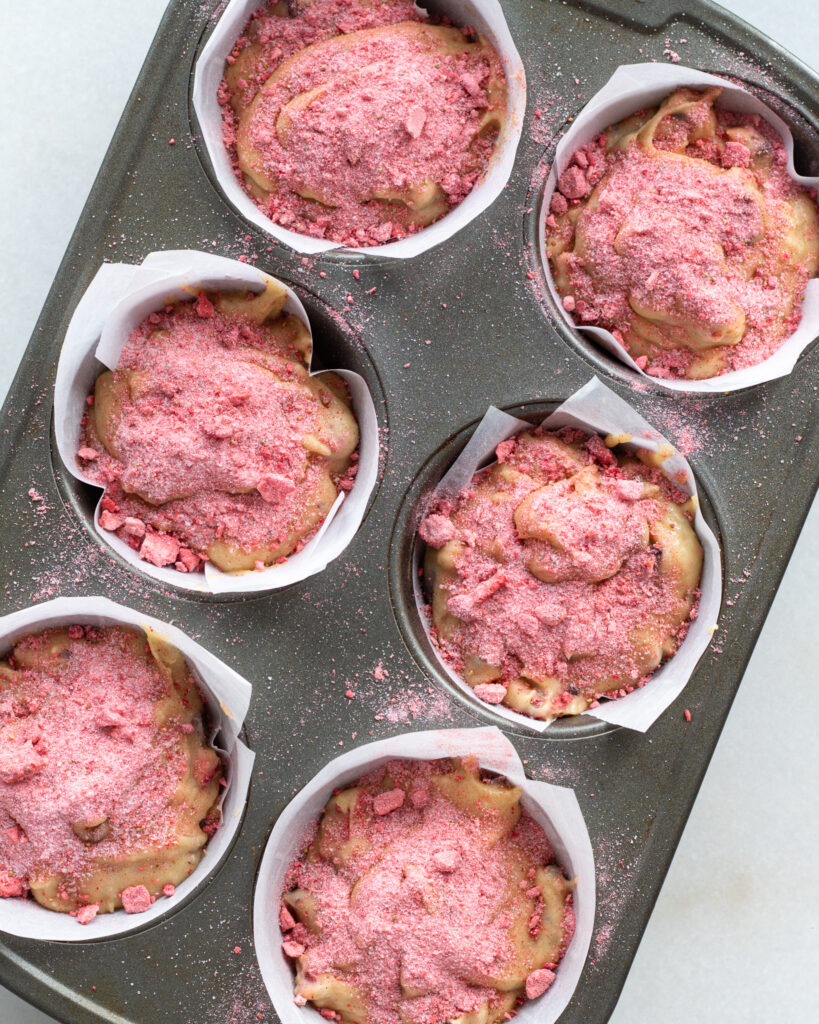 Add a generous sprinkling of the pink strawberry sugar to the middle, then top off the muffin with more batter. You should have a tablespoon or so of strawberry sugar left over, reserve that for later.