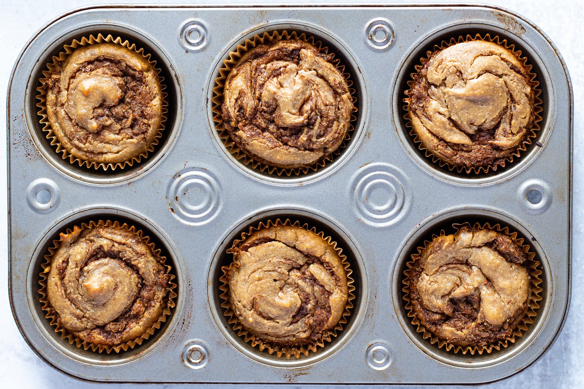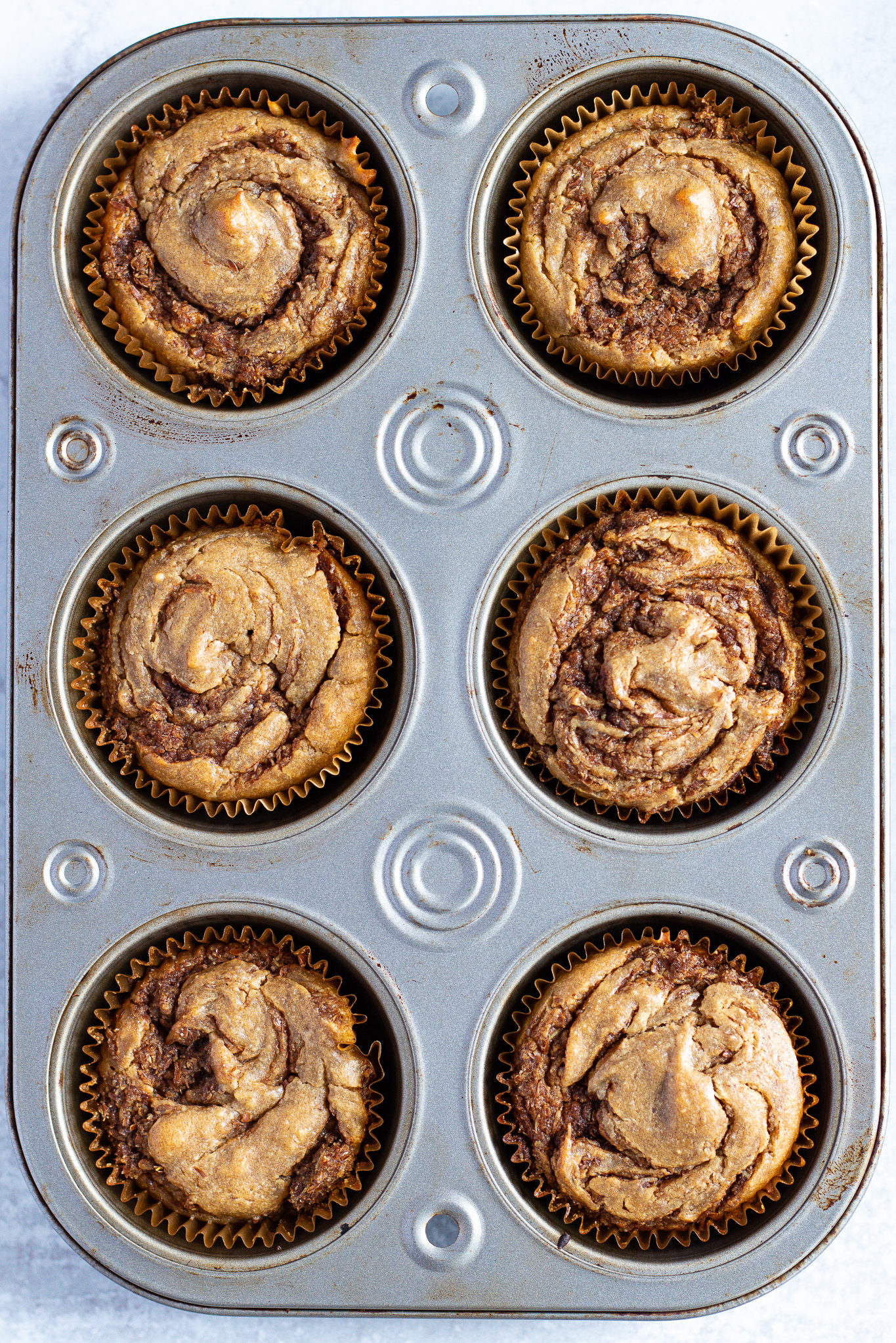 - Top off each muffin with one more spoonful of batter so that the cinnamon swirl is slightly covered, but not completely.