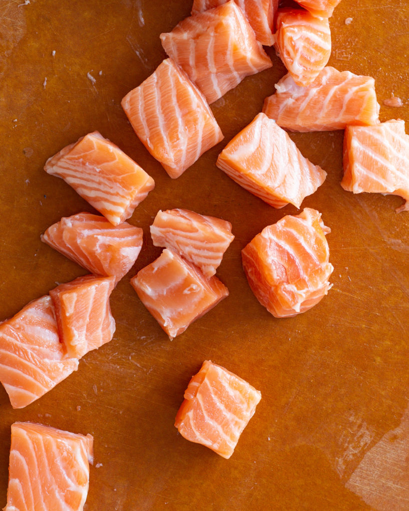 For this recipe, I recommend using a full salmon fillet, about a pound, that is fresh and ready to use. I like to get my salmon from sustainable fish farmers, but it is up to you where you source it!