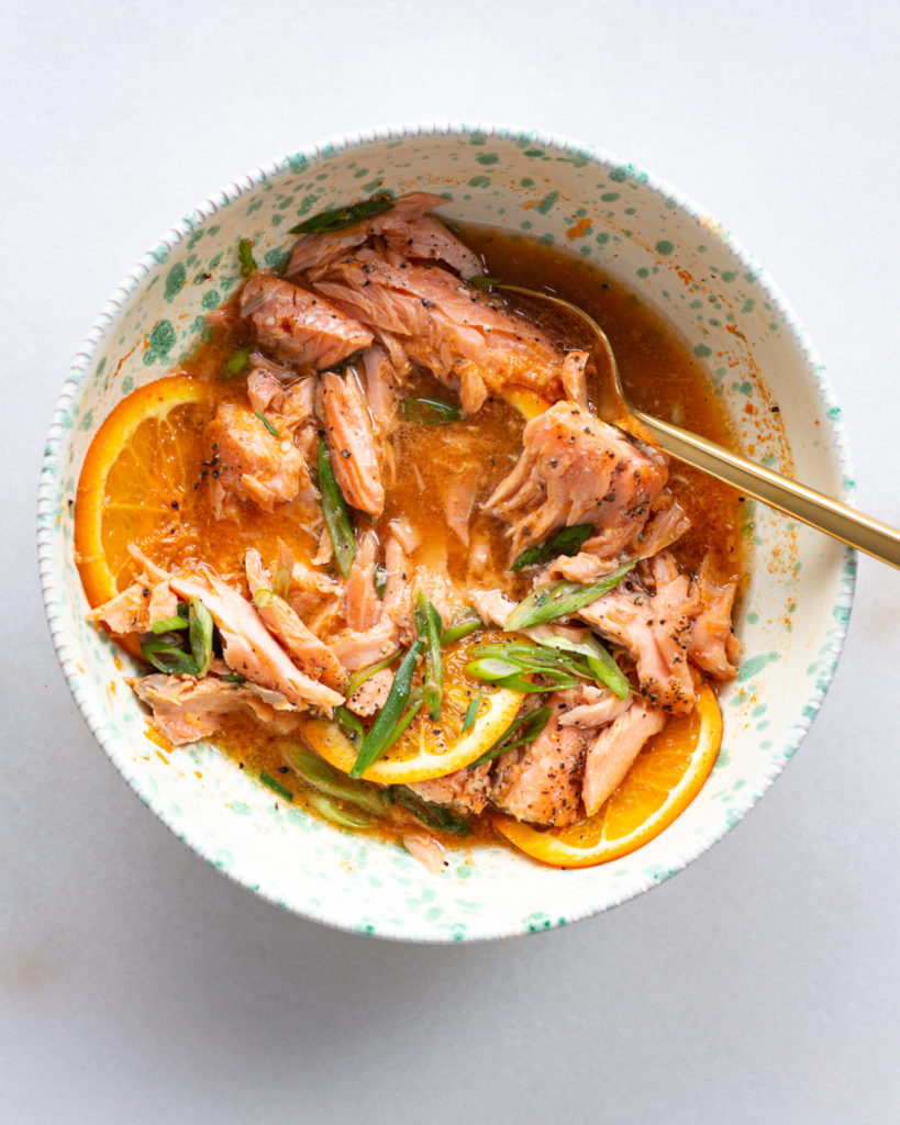 It uses a “reverse marinade” method where you cook the salmon first, and then add it to the citrusy broth after. Then just scoop and serve or eat straight from the bowl. It’s amazing with rice, quinoa, noodles, any grain or starch. And it can be adapted just for one or to feed a crowd.