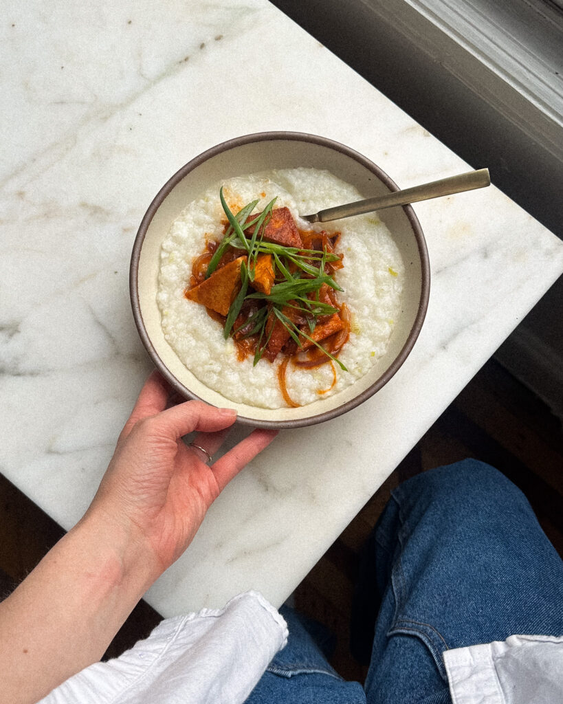 Of course, I like textural interest with all of my meals, so I find pairing congee with a crispy, spicy brown butter gochujang tofu and light, aromatic scallions makes the perfect meal. It’s equal parts fresh but comforting, vibrant but calm, and absolutely delicious. If you are looking for an easy, filling and vegetarian weeknight meal, I suggest you make this ASAP.