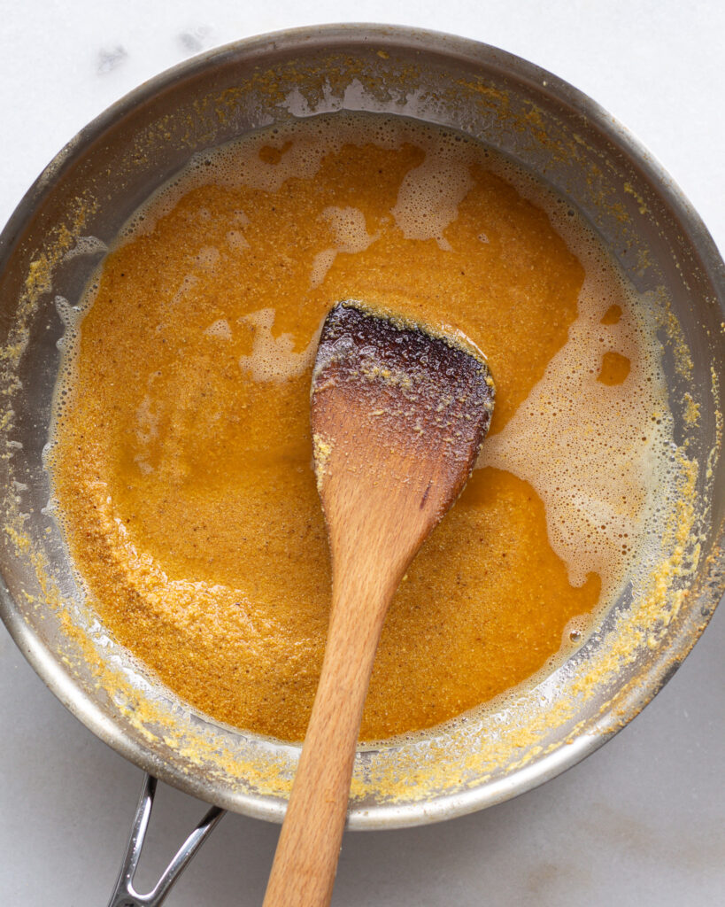 Allow the butter to fully melt, then cook, stirring often. Let the butter begin to foam, and the whole mixture will begin to thicken and darken to a golden brown (see above) as the butter browns and the moisture evaporates.