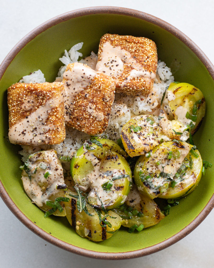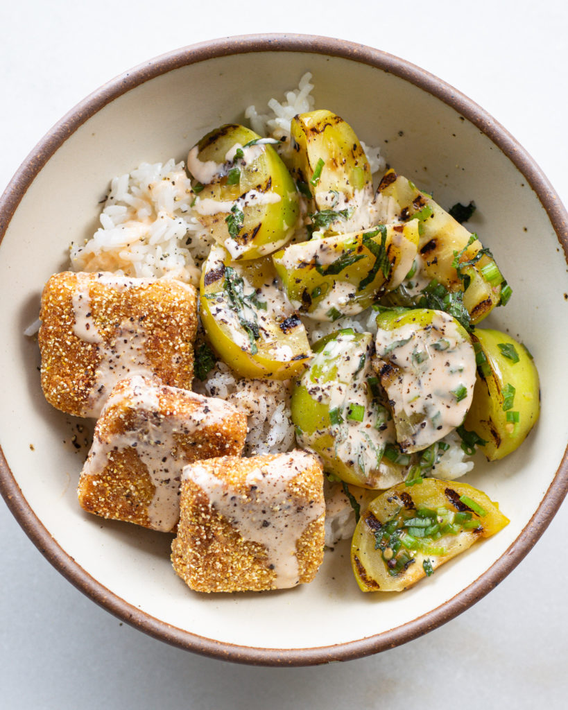 “Fried Green Tomatoes” is my favorite movie (or at least one of them), and this cornmeal crusted tofu recipe with grilled green tomatoes is like my version of that movie, but in recipe form. This is peak comfort food, it just feels like a warm hug. And yes, it does take a bit of effort to make, but that effort just means there is so much love in the recipe. Plus, you can always twist and tweak it a bit to make it a bit more doable on a weekday.