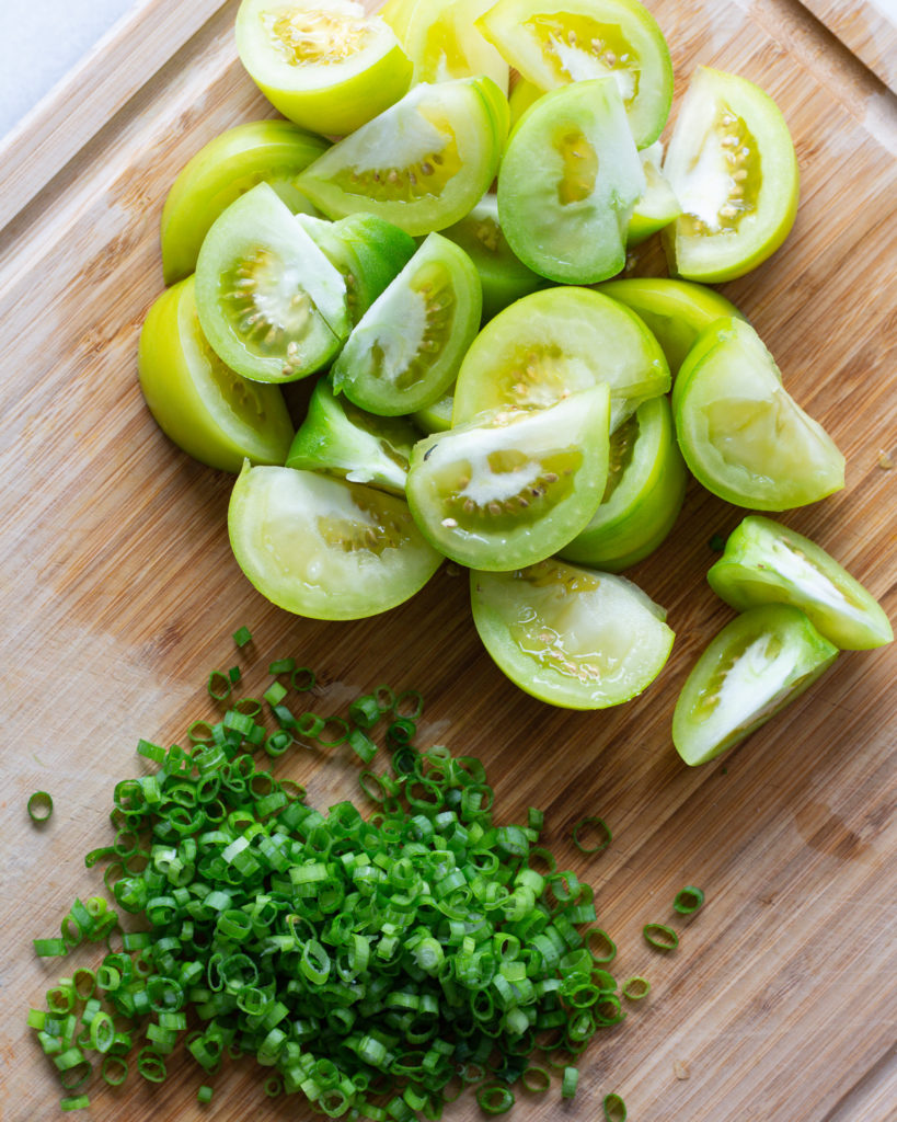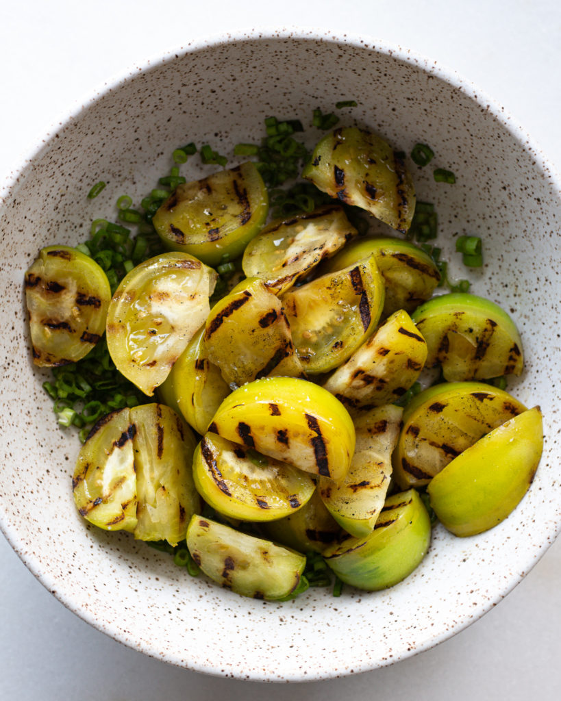 Here you just slice the scallions and add them to a bowl. Squeeze in the lemon juice, and then pour in the grilled green tomatoes. Toss to coat and season with salt as needed. Taste and adjust as you like – this part is up to you!