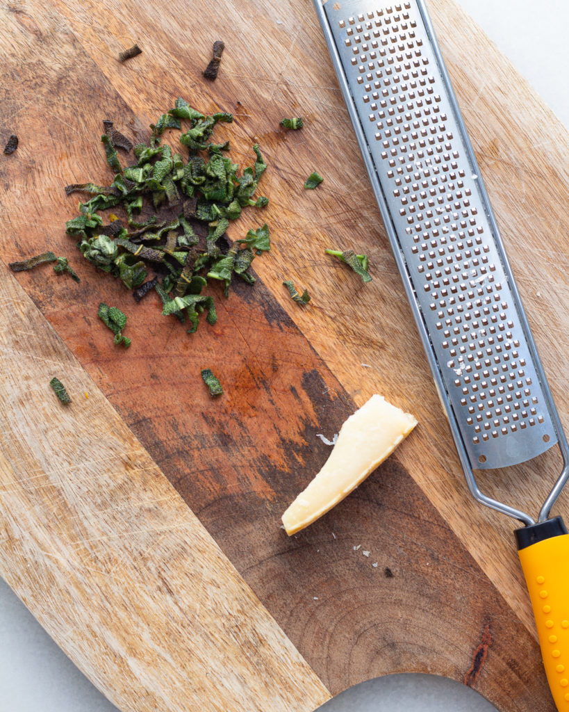 - To make the crispy sage, roughly chop the sage leaves and toss in a small coating of olive oil. Spread it on a baking sheet and broil on high for 3 minutes or until the sage is crispy.