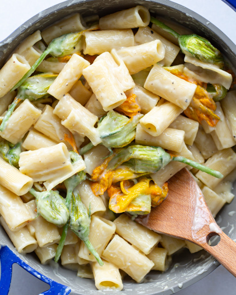 Toss in the squash blossoms and stir until they are as equally creamy as the pasta.