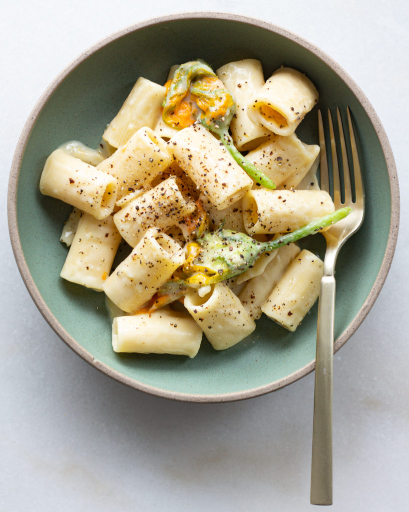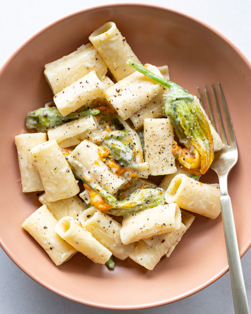 Everyone needs a good creamy pasta recipe, it’s good for the soul, and this creamy, easily-veganized, lemon pepper pasta is one of my summer favorites. The squash blossoms are optional, but they add a lovely color, flavor, and something extra to this humble little lemon pasta dish.