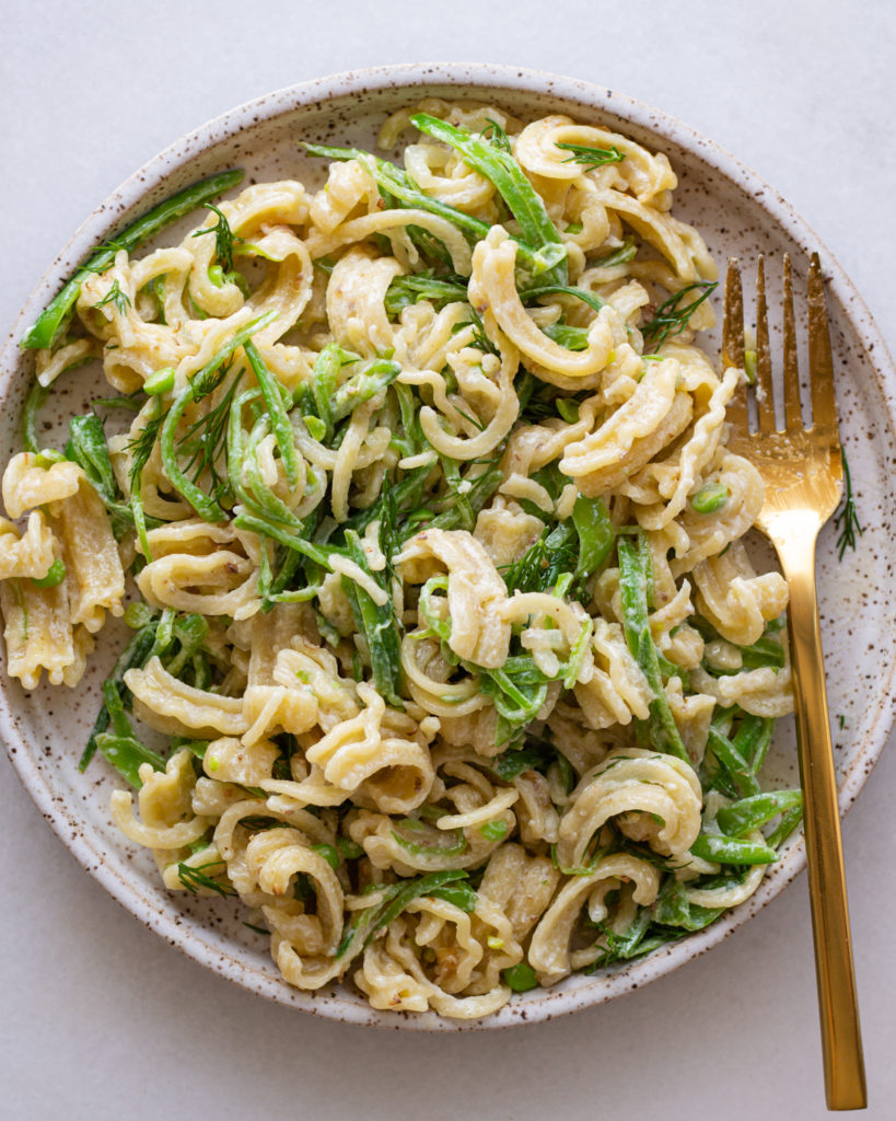 Sometimes we just need a creamy pasta, it’s good for the soul – and this creamy snap pea pasta proves it. It’s rich because of the tahini we add for the signature creaminess, but still bright and fresh and filled with spring flavors. It’s my current comfort food, and it screams “spring” to me. I just can’t get enough of this as the weather gets warmer and as we transition into summer.