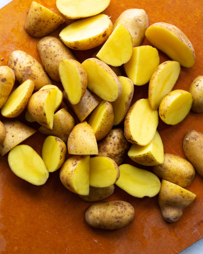 So fun fact, new potatoes aren’t actually a potato variety. They are early harvested potatoes of several varieties! They are part of the “waxy” category of potatoes which does not make them your typical starchy potato used for roasting, but I love them for this recipe because of their creamy interior and delicate skin. The skin makes them easy to thinly slice, and perfect for roasting with the skin-on.