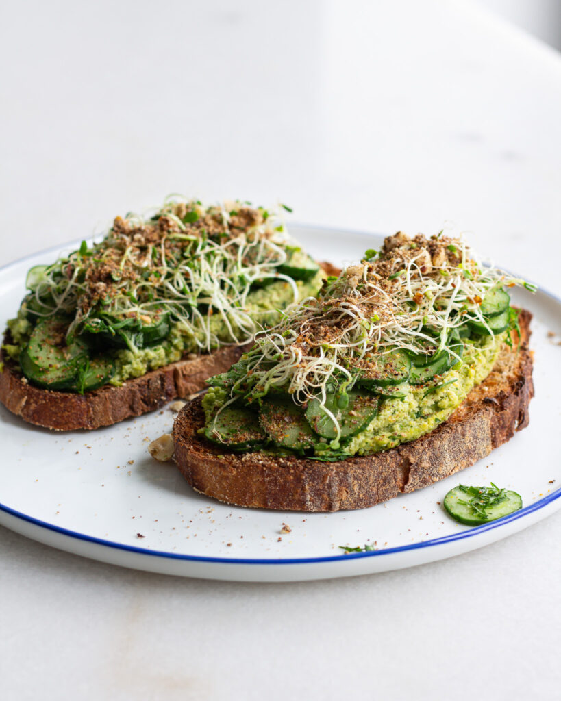 - To serve, scoop a healthy portion of the edamame spread onto each slice of toast. Top with the cucumber salad, then 1/4 cup of alfalfa sprouts per toast. Sprinkle with the seed mix and serve!