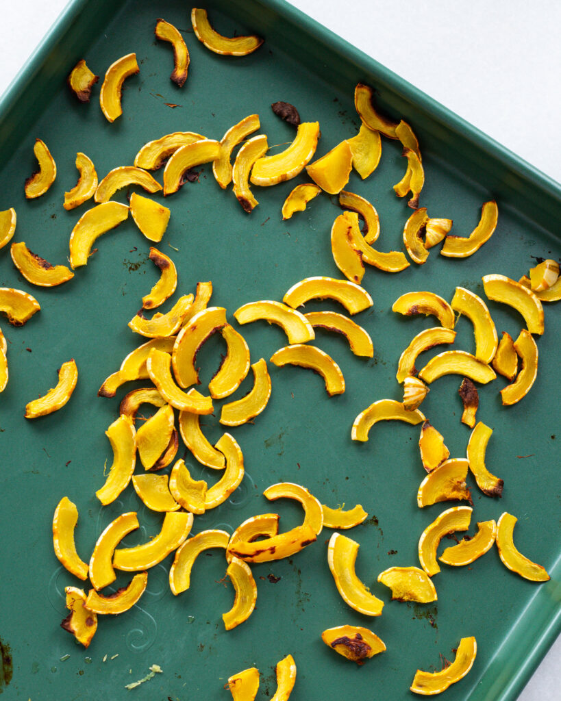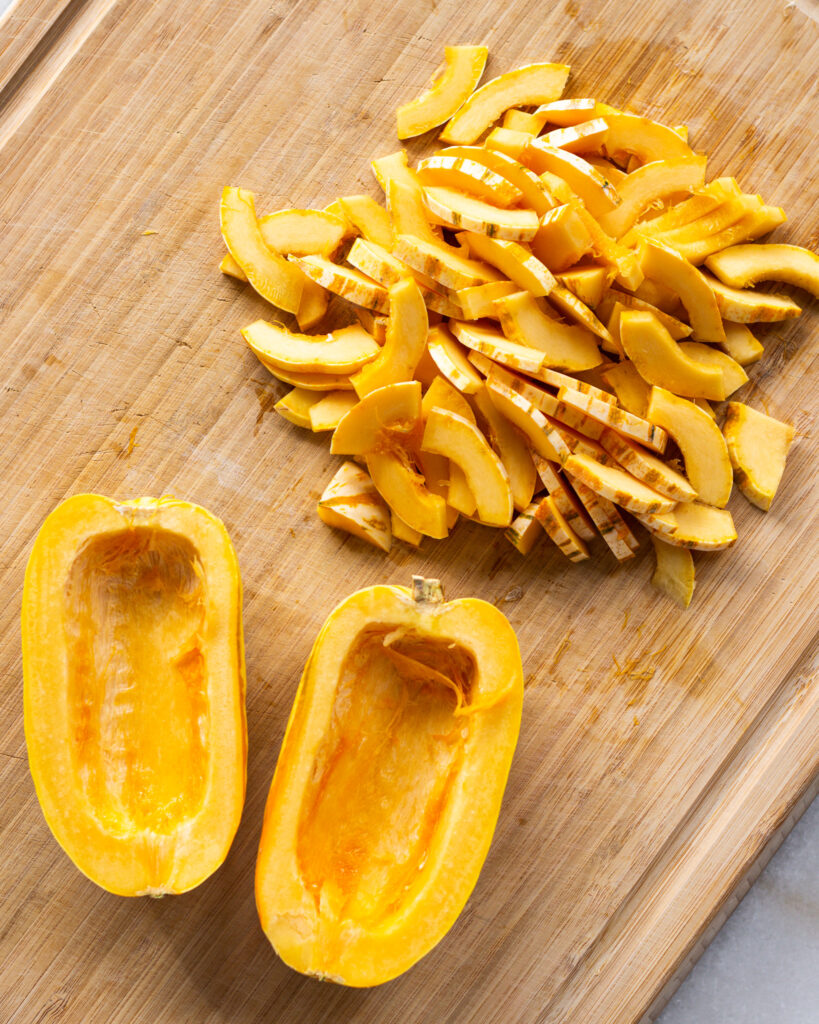 The squash is the easy part, you’ll want to roast it cut two ways. So preheat the oven to 400°F, cut one squash into pieces (see photo below) and the other squash in half. Roast at the same time for about 18-25 minutes!