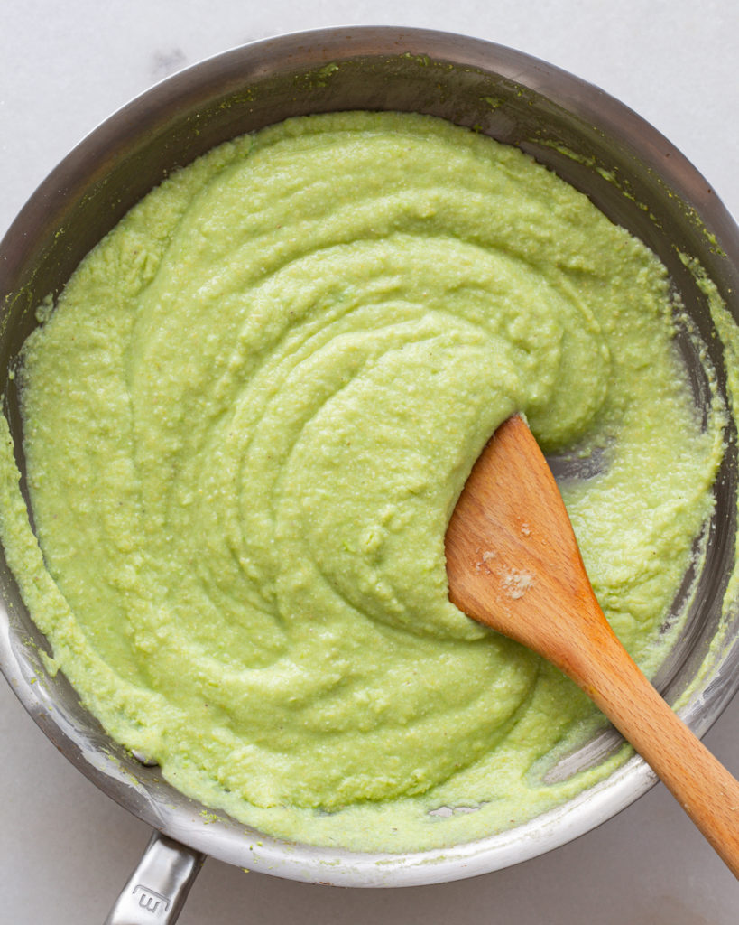 - Put a large pan on medium heat, add the cornmeal and the edamame mixture to the pan and stir to combine. Make sure there are no clumps.