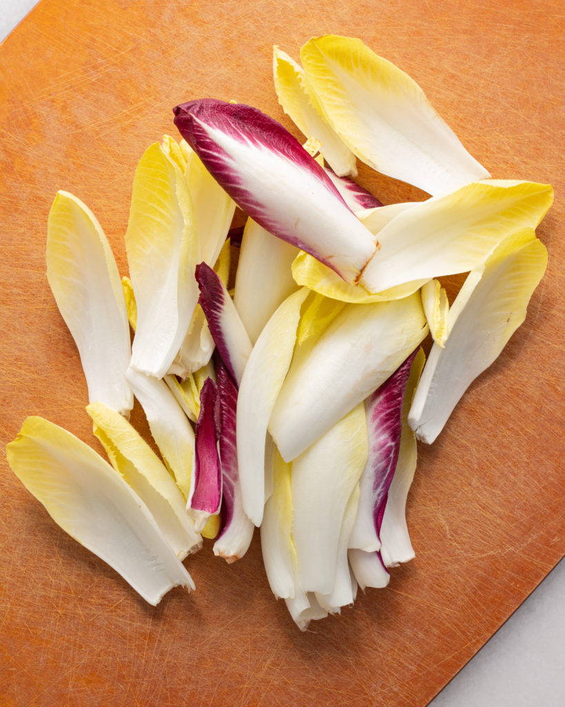 - Add the endive leaves to the bowl and toss to fully coat them.